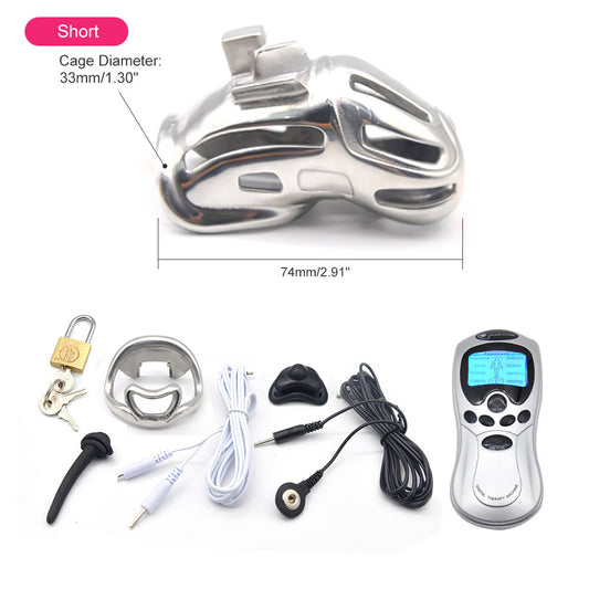 The E-Stim Chastity Cage uses metal electroshock accessories to provide electric shocks to both the penis and scrotum. The shock accessories are detachable, and when removed, it functions as a regular chastity cage with a scrotum bag.